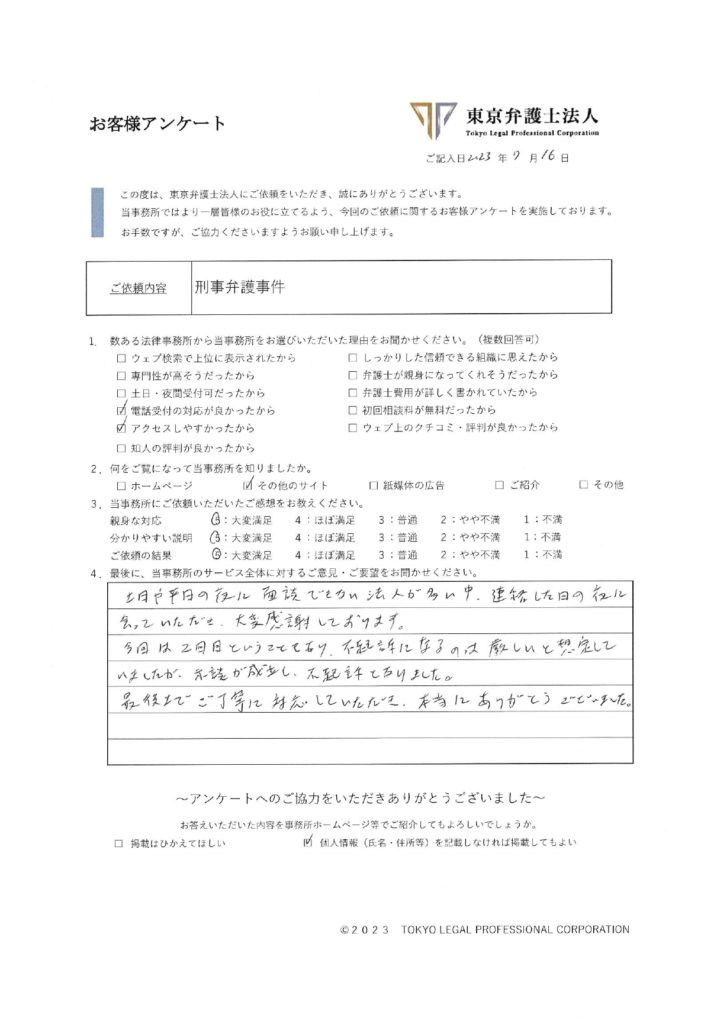 今回は2回目ということもあり、不起訴になるのは難しいと想定していましたが、示談が成立し、不起訴となりました。最後までご丁寧に対応していただき、本当にありがとうございました。
