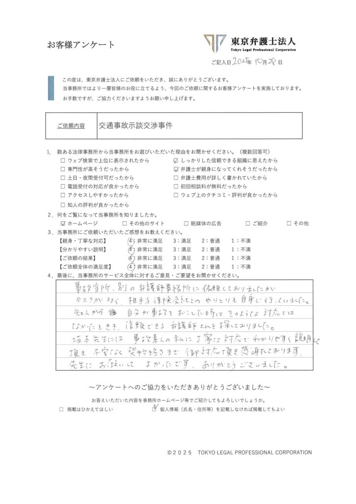 坂本先生には、事故素人の私に丁寧な対応でわかりやすく説明して頂き、不安なく契約終了まで御対応頂き感謝しております。先生にお願いしてよかったです。ありがとうございました。