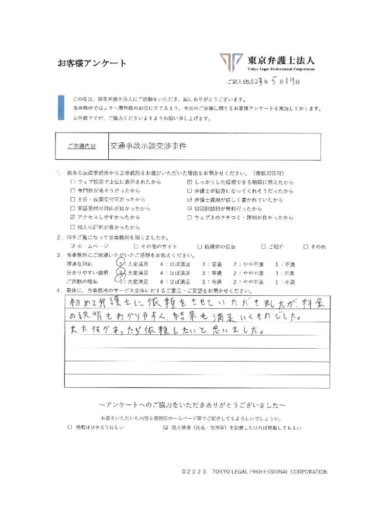 初めて弁護士に依頼をさせていただきましたが、料金の説明もわかりやすく、結果も満足いくものでした。