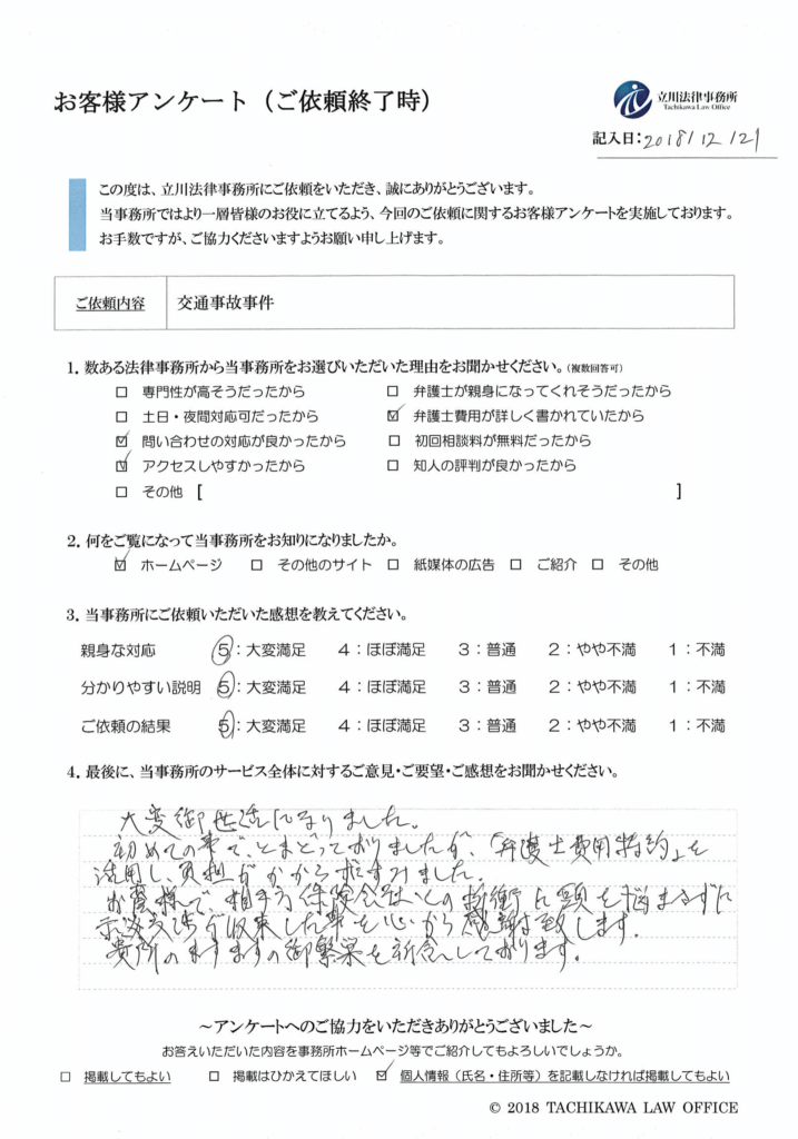 お蔭様で、相手方保険会社との折衝に頭を悩まさずに示談交渉が収束した事を心から感謝致します。