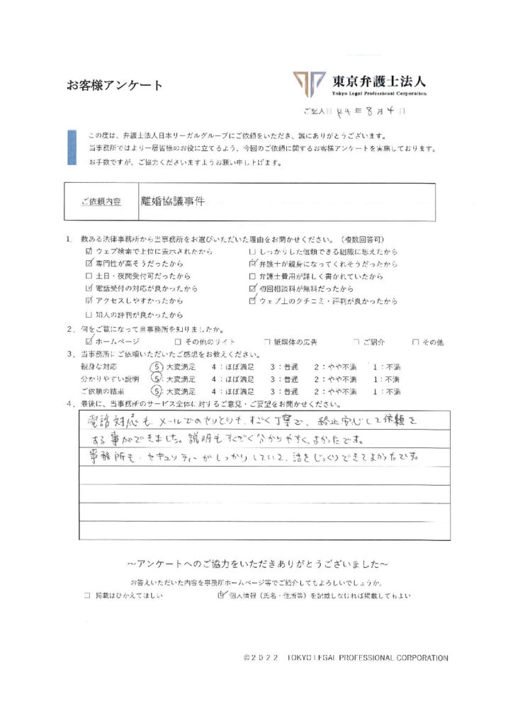 電話対応もメールでのやりとりも、すごく丁寧で、終止安心して依頼をする事ができました。説明もすごく分かりやすく、よかったです。事務所も、セキュリティーがしっかりしていて、話をじっくりできてよかったです。
